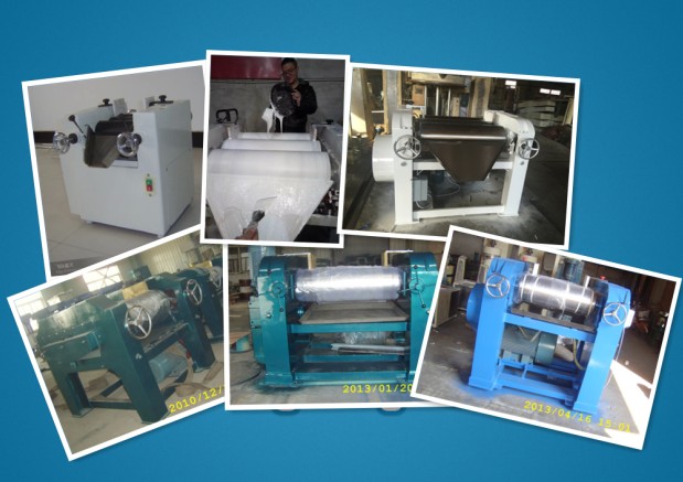 該設(shè)備由三個輥筒組成,裝在一個機(jī)架上,由電機(jī)直接帶動。一般輥筒間的轉(zhuǎn)動方向不同,前輥向前轉(zhuǎn)動,中輥向后轉(zhuǎn)動。輥?zhàn)愚D(zhuǎn)速前輥快、后輥慢。中間輥固定,前后兩輥裝在滑道上,有彈簧裝置,用手輪調(diào)節(jié)前后輥與中輥的距離。物料由后輥與中輥之間進(jìn)入,受到輥筒的擠壓,產(chǎn)品顆粒變細(xì),然后由快輥帶出,快輥末端裝有刮刀,使物料與輥筒分離,落入收集桶內(nèi)。由于研磨過程產(chǎn)生大量熱量,各輥筒的中心是設(shè)計為空心結(jié)構(gòu),通水冷卻,保證產(chǎn)品質(zhì)量。